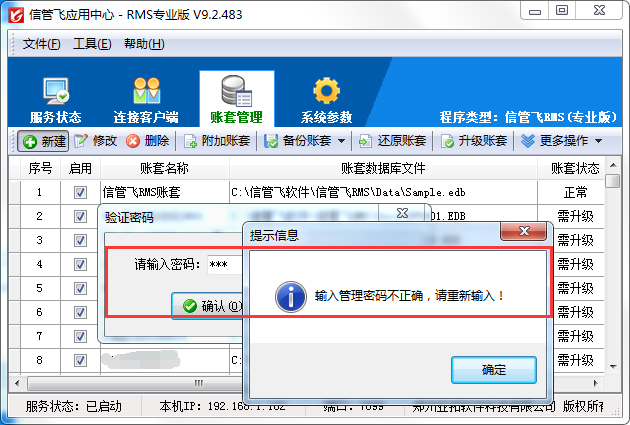 ????信管飛RMS、信管飛倉(cāng)庫(kù)管理軟件、信管飛送貨單軟件、信管飛出納記賬軟件、信管飛票據(jù)打印軟件等軟件都含有賬套管理功能,在應(yīng)用中心內(nèi)支持建立多個(gè)賬套,已使用的帳套如果不再繼續(xù)使用,可以停用帳套,停用帳套后,客戶(hù)端程序登錄時(shí)將無(wú)法再連接該帳套。本文我們以信管飛倉(cāng)庫(kù)管理軟件為例演示一下如何停用帳套。