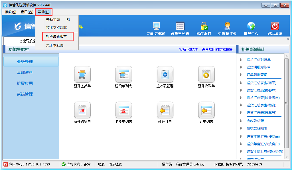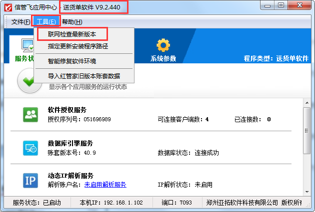 ????本文我們以紅管家送貨單軟件為例,截止到本文發(fā)布日期,紅管家送貨單軟件最新版是V8.5.217版本,我們以V8.5.210版本為例介紹下軟件聯(lián)網(wǎng)檢查最新版的兩種方法。