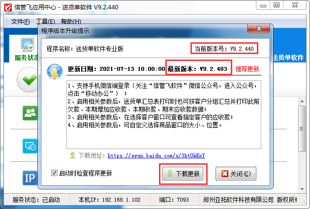 ????信管飛送貨單軟件、信管飛RMS軟件、信管飛倉(cāng)庫(kù)管理軟件等都支持網(wǎng)絡(luò)版本(即可以多臺(tái)機(jī)器同時(shí)使用,數(shù)據(jù)共享,數(shù)據(jù)集中存儲(chǔ)在一臺(tái)機(jī)器上),軟件會(huì)不定期更新新版本,網(wǎng)絡(luò)版多臺(tái)電腦使用的時(shí)候,每次更新程序需要每臺(tái)電腦都下載最新版安裝程序進(jìn)行安裝,非常麻煩。軟件支持在主機(jī)電腦的應(yīng)用中心程序上指定更新安裝程序,便于客戶(hù)端登錄的時(shí)候如版本不一致會(huì)提示直接下載安裝程序。