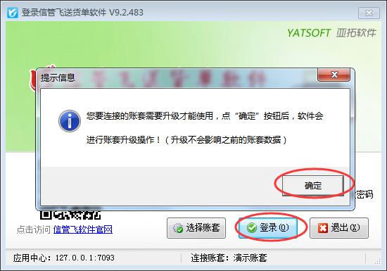 ????二、直接登錄客戶(hù)端程序進(jìn)行升級(jí);新版本安裝完成后,直接打開(kāi)客戶(hù)端程序,點(diǎn)擊“登錄”按鈕會(huì)提示“您連接的賬套需要升級(jí)才能使用,點(diǎn)“確定”按鈕后,軟件會(huì)進(jìn)行賬套升級(jí)操作!(升級(jí)賬套不會(huì)影響之前的賬套數(shù)據(jù))”,點(diǎn)擊“確定”后可直接升級(jí)賬套。如下圖所示: