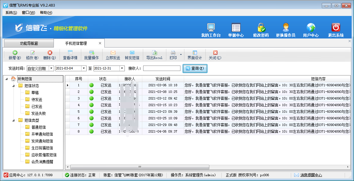 ????信管飛RMS專(zhuān)業(yè)版、標(biāo)準(zhǔn)版、星光版都是支持手機(jī)短信功能,我們可以根據(jù)自己的業(yè)務(wù)需求選擇相應(yīng)的版本,下面我們以信管飛RMS專(zhuān)業(yè)版為例介紹一下手機(jī)短信功能的使用方法及步驟: