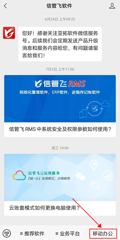 ????云應用支持移動端APP和微信公眾號移動辦公使用,APP可在應用市場搜索“信管飛”和“信管飛記賬”;微信關注“信管飛軟件”微信公眾號,點擊右下方移動辦公連接使用。 ????可實現7*24小時不間斷服務,