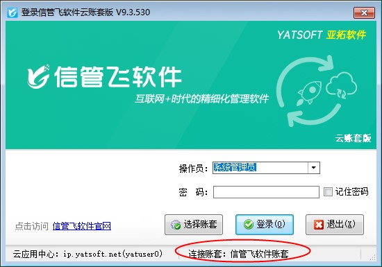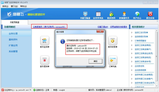 ????云賬套服務是信管飛軟件推出的數據存在云端,通過通行證賬號和密碼連接云端數據,此服務不限時間和地點,有網絡就可以使用。云賬套服務按年收費,為避免不清楚什么時間到期續費影響軟件使用,軟件增加可在登錄界面查看服務期的功能。
