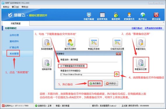 ????請用系統管理員賬號登錄信管飛送貨單軟件試用版,然后在功能導航窗中點擊“系統管理”—》“賬套備份還原”,在打開的“賬套備份”窗口勾選“下載賬套備份文件到本地”,選擇備份文件存儲路徑,然后“執行備份”即可,備份完成后在所選備份文件存儲的路徑,會自動生成一個后綴名為.dbk的文件,為賬套備份文件,可用于上傳到云賬套,如下圖所示