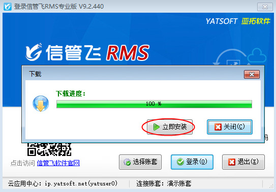 ????然后,系統會自動下載最新版安裝程序,下載進度條顯示100%后點擊“立即安裝”,將安裝最新版客戶端,點擊“下一步”默認安裝到原路徑即可,如下圖所示: