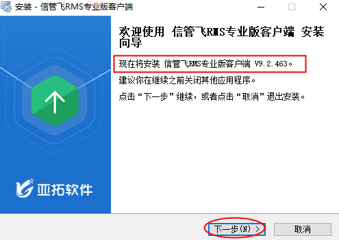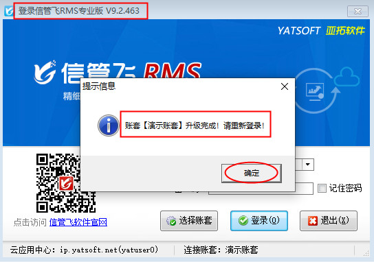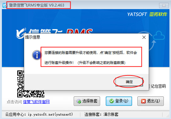 ????有用戶登錄云賬套時,系統提示“客戶端與云應用中心要求的版本號不一致,請升級更新后再登錄!”如下圖所示,登錄時之所以會提示升級版本,是因為亞拓軟件自主研發的軟件是不斷升級優化的,發布新版本后,云賬套模式的客戶端需要和云應用中心的版本一致才可以登錄,下面我們以信管飛RMS專業版為例,介紹下如何升級到最新版本軟件?