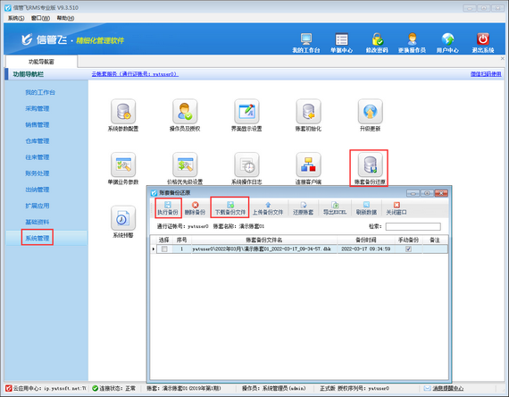 ????登錄已有賬套,然后在功能導航窗中點擊“系統管理”—》“賬套備份還原”,在打開的“賬套備份還原”窗口,執行備份并將備份文件下載到本地存儲,如下圖所示。