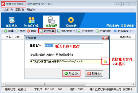 ????解決辦法:出現(xiàn)此種情況需附加下賬套,在賬套管理界面點擊“附加賬套”,選擇賬套文件進行附加。如下圖所示,附加后登錄客戶端程序,點擊選擇賬套重新選擇進行登錄。