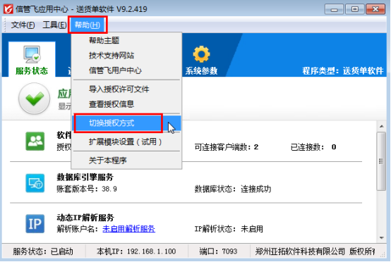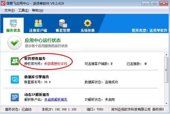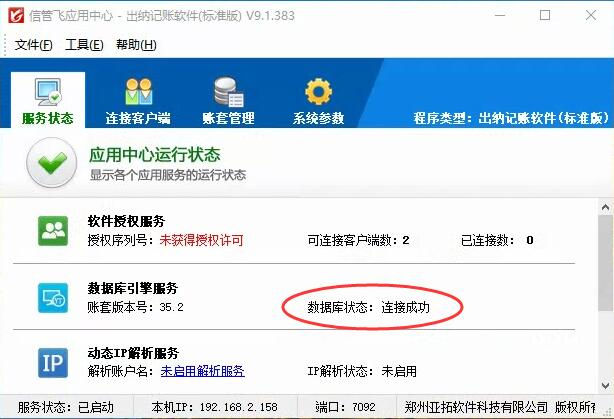 ????信管飛應(yīng)用中心退出后請重新運行信管飛應(yīng)用中心程序,應(yīng)用中心啟動后,請檢查服務(wù)狀態(tài)是否已啟動正常,軟件授權(quán)服務(wù)是否顯示正常及數(shù)據(jù)庫狀態(tài)是否連接正常,正常狀態(tài)如下圖所示,服務(wù)狀態(tài)顯示正常,請嘗試重新登錄軟件。