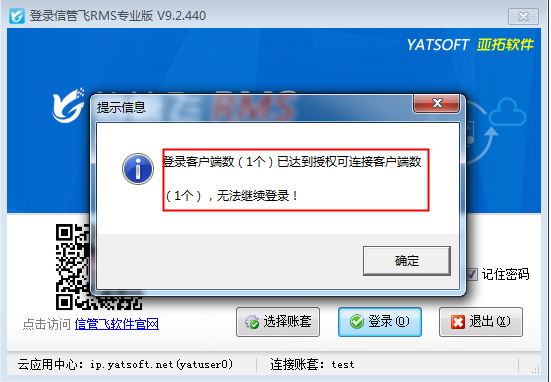 ????信管飛所有軟件都支持云賬套服務(wù)模式,數(shù)據(jù)存在云服務(wù)上,本地只要有網(wǎng)絡(luò)就可以登錄客戶端程序連接數(shù)據(jù)使用,云賬套模式是按用戶數(shù)進行收費使用的,經(jīng)常有客戶反映登錄其它電腦客戶端的時候提示“登錄客戶端數(shù)已達(dá)到授權(quán)可連接用戶數(shù),無法繼續(xù)登錄”,如下圖所示。為了可繼續(xù)使用,軟件支持可直接操作“斷開連接”,本文以信管飛RMS軟件為例進行示范。
