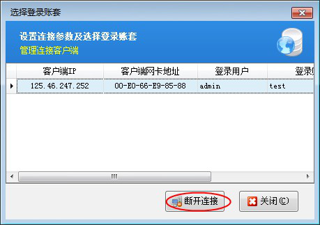 ????點擊“是”,進入管理連接客戶端界面。可以選擇當(dāng)前登錄的連接,點擊“斷開連接”,可斷開當(dāng)前已登錄的客戶端程序,然后可以重新登錄。如下圖所示: