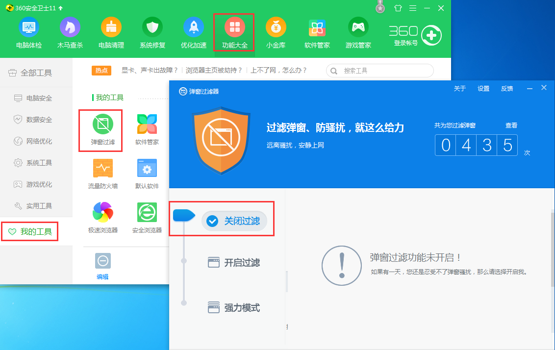 ????打開360安全衛(wèi)士,在“功能大全”—》“我的工具”內(nèi)找到“彈窗過濾”工具打開彈窗過濾器,點擊“關(guān)閉過濾”即可。