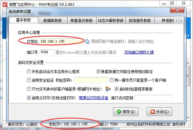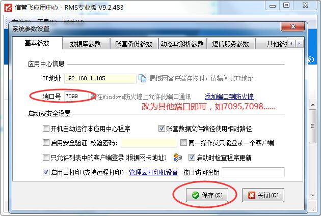 ????修改通訊端口的方法也很簡單,在“信管飛軟件應(yīng)用中心”程序中,點“系統(tǒng)參數(shù)設(shè)置”中基礎(chǔ)參數(shù)中修改端口號為其他未使用的端口即可,比如7098、7097、7096...,修改保存參數(shù)后,需重啟“亞拓軟件應(yīng)用中心”程序,以便使配置生效。同時,客戶端程序登錄的時候,也要使用新的端口(方法:在登錄窗口,點“選擇賬套”按鈕,輸入新的通訊端口號)。