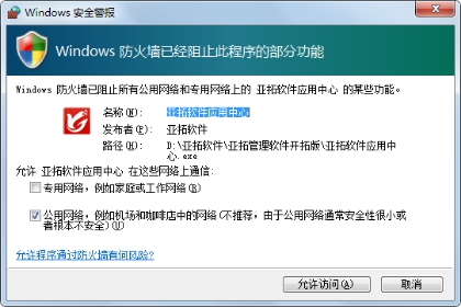 ????首次運行應(yīng)用中心程序,如果防火墻彈出提示窗口,則Win7系統(tǒng)請點擊“允許訪問”按鈕允許訪問(專有網(wǎng)絡(luò)不需要打勾選擇);WinXP系統(tǒng)請點擊“解除阻止”按鈕即可。