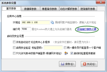 ????主機電腦的Windows防火墻或其他安全軟件的防火墻上需要開放相應(yīng)的端口,軟件支持自動添加防火墻規(guī)則。在應(yīng)用中心程序點“系統(tǒng)參數(shù)”可以設(shè)置自動添加端口到防火墻。