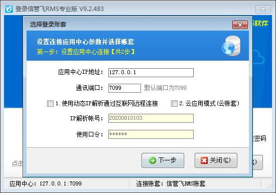 ????點擊桌面上的“信管飛RMS”程序(以下簡稱“客戶端程序”)圖標(biāo)(或者在開始菜單中點擊程序組中的相應(yīng)功能),即可打開客戶端程序。點“選擇賬套”按鈕,可以輸入“應(yīng)用中心”所在電腦(即主機電腦)的IP地址以及通訊端口,如果是通過互聯(lián)網(wǎng)遠(yuǎn)程連接請輸入購買動態(tài)IP解析服務(wù)后我們提供的IP解析帳號和使用口令,然后點“下一步”按鈕,選擇要登錄的賬套。
