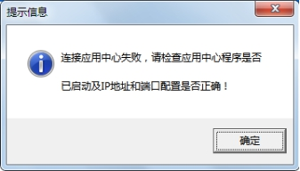 ????部分用戶有時在登陸軟件時會提示“連接應(yīng)用中心失敗,請檢查應(yīng)用中心程序是否已啟動及IP地址和端口配置是否正確!”,如下圖所示。