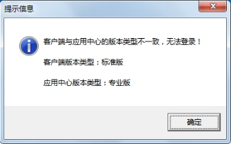 ????③如果登錄的時候提示如下信息,則表明客戶端程序的版本類型與主機電腦上的應(yīng)用中心程序的版本類型不一致,請使用相同版本類型的程序登錄即可。