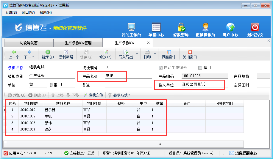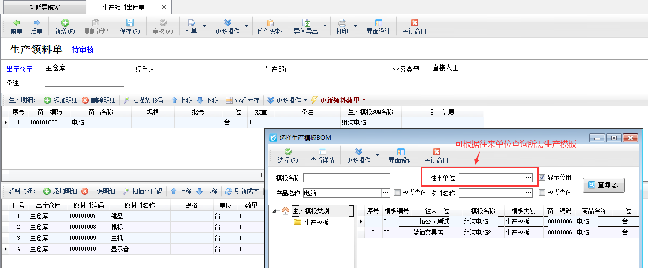 ????參數配置完成之后,打開生產管理模塊,重新新增生產模板BOM表時,即可選擇往來單位,如下圖所示,在給“亞拓公司測試”、“藍貓文具店”兩家客戶生產同樣的產品“電腦”時設置的不同的生產模板,所需的原材料不同。