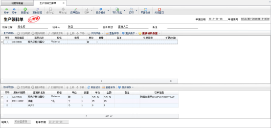 ????生產過程中可通過開“生產領料出庫單”領取原材料出庫。生產領料單包括生產產品明細和領料明細兩部分,支持根據“生產模板”自動生成需要的原材料明細。生產明細中的商品并不影響倉庫庫存,領料明細中的原材料將會出庫。