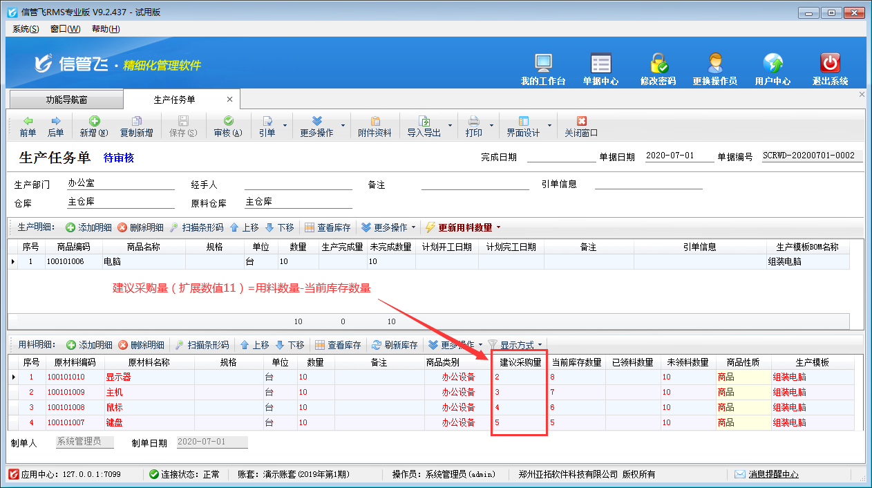 ????然后重新開生產任務單時,即可根據原材料用料數量及原材料當前庫存數量自動計算出原材料需采購的數量,如下圖所示。