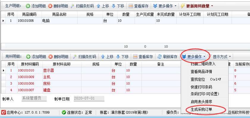 ????點擊“用料明細”工具欄“更多操作”—》“生成采購訂單”即可將原材料建議采購量直接生成采購訂單便于采購人員進行采購,如下圖所示。