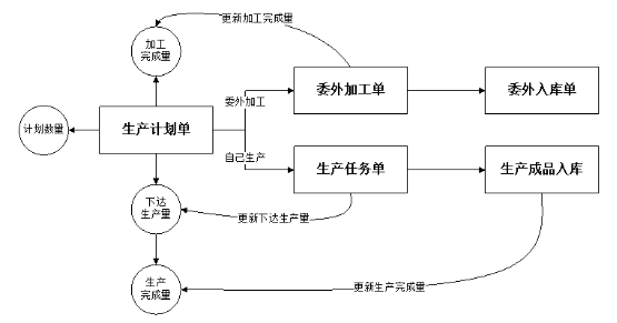 ????②生產計劃明細中只能輸入計劃數量(即計劃生產數量),其他數量由后續單據執行后自動更新。下圖為不同業務單據更新相應數量示意圖: