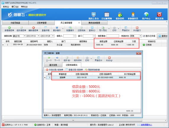 # 6.9.1 出納記賬軟件中報(bào)銷金額大于借款金額時(shí),如何給員工找錢?