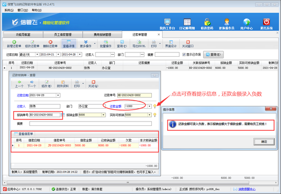 ????如下圖所示,員工“張偉”借款金額為5000元,費(fèi)用報(bào)銷了6000元,報(bào)銷金額大于借款金額,導(dǎo)致欠款-1000元,需退還給員工。這種情況下,需做還款單,進(jìn)行還款處理,將欠款金額清零。