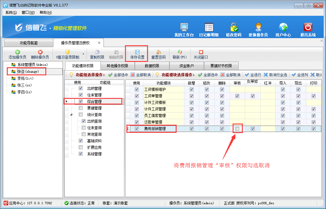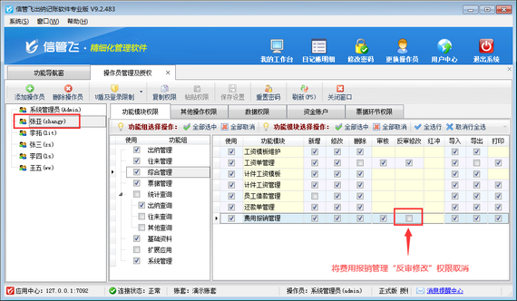 ????在功能導(dǎo)航窗點(diǎn)擊“系統(tǒng)管理”—》“操作員及授權(quán)”打開操作員管理及授權(quán)界面,選擇操作員“張亞”,在功能模塊權(quán)限界面,選擇“綜合管理”—》“費(fèi)用報(bào)銷管理”,把費(fèi)用報(bào)銷管理“反審修改”權(quán)限勾選取消,然后保存權(quán)限設(shè)置,如下圖所示: