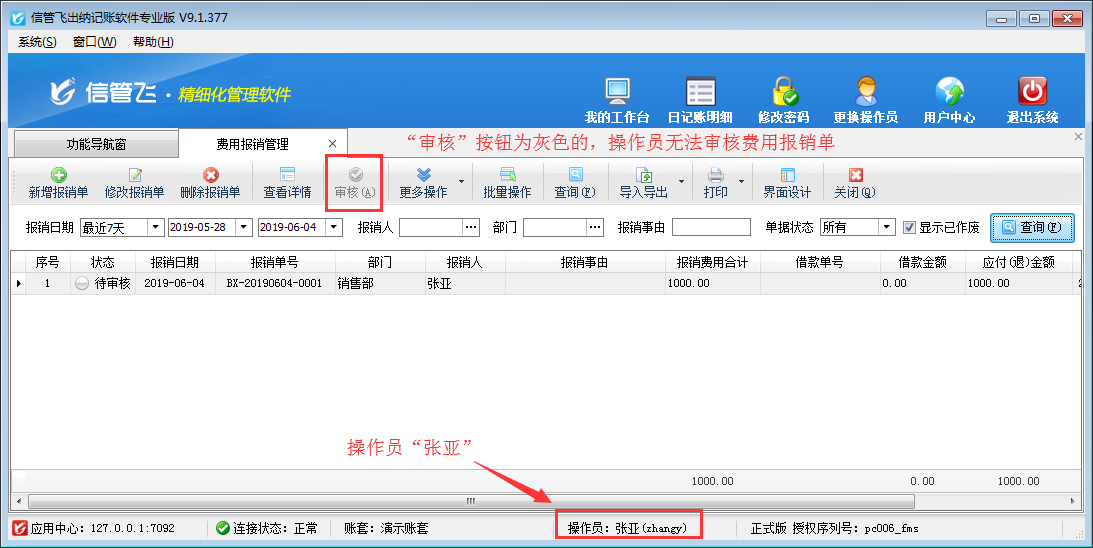 ????在日常工作中,因?yàn)榕R時(shí)事件的發(fā)生,員工經(jīng)常會(huì)自己墊付工作所需要的各項(xiàng)費(fèi)用。這些費(fèi)用在月末時(shí)可以填寫費(fèi)用報(bào)銷單進(jìn)行統(tǒng)一的報(bào)銷。信管飛出納記賬軟件專業(yè)版有費(fèi)用報(bào)銷管理功能,可以管理費(fèi)用報(bào)銷單,并支持設(shè)置操作員費(fèi)用報(bào)銷單審核權(quán)限,下文我們詳細(xì)介紹一下出納記賬軟件內(nèi)如何設(shè)置操作員不允許審核費(fèi)用報(bào)銷單?