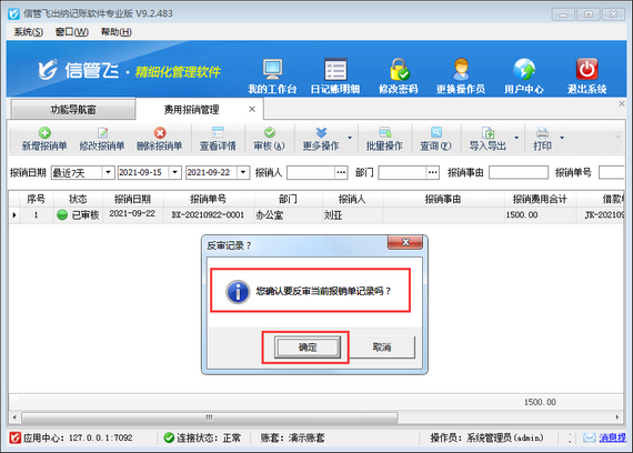 ????費(fèi)用報(bào)銷單保存審核后默認(rèn)不允許直接修改,但是部分客戶需要對已審核的費(fèi)用報(bào)銷單進(jìn)行修改,軟件支持反審費(fèi)用報(bào)銷單功能,如下圖所示。本篇文章介紹一下出納記賬軟件中如何設(shè)置操作員不允許反審費(fèi)用報(bào)銷單?