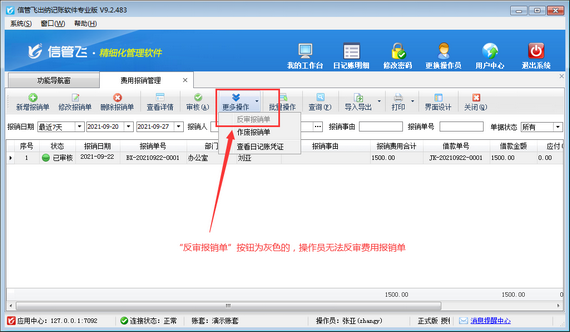 ????權(quán)限設(shè)置完成后,使用操作員“張亞”登錄軟件,打開費(fèi)用報(bào)銷管理界面,在工具欄點(diǎn)擊“更多操作”,可以看到“反審報(bào)銷單”按鈕為灰色的,操作員無法反審費(fèi)用報(bào)銷單。如下圖所示: