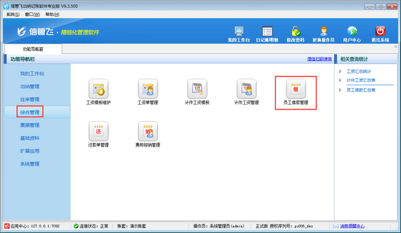 ????在功能導(dǎo)航窗點(diǎn)擊“綜合管理”—》“員工借款匯總表”即可進(jìn)入員工借款匯總表界面,如下圖所示。