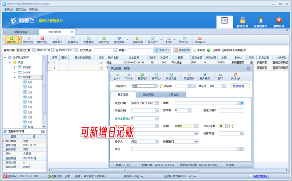 在數(shù)字化財(cái)務(wù)管理中,精準(zhǔn)的權(quán)限管理是保障數(shù)據(jù)安全與效率的核心。若操作員賬號(hào)登錄信管飛出納記賬軟件后無(wú)法新增日記賬憑證,通常源于權(quán)限配置未啟用。本篇文章為您呈現(xiàn)高效解決方案。 使用系統(tǒng)管理員賬號(hào)登錄軟件,在功能導(dǎo)航窗點(diǎn)擊“系統(tǒng)管理”—》“操作員及授權(quán)”打開(kāi)操作員管理及授權(quán)界面,選擇操作員賬號(hào),在其右側(cè)的功能模塊權(quán)限內(nèi)選擇“出納管理”,將現(xiàn)金(銀行)日記賬的“新增”權(quán)限勾選上,然后保存權(quán)限設(shè)置,如下圖所示。 權(quán)限設(shè)置完成后,更換操作員賬號(hào)“張亞”重新登錄軟件,即可新增現(xiàn)金(銀行)日記賬,如