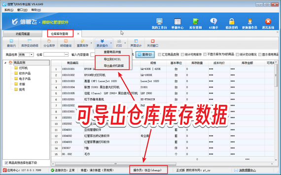 信管飛RMS支持倉(cāng)庫(kù)庫(kù)存查詢功能,倉(cāng)庫(kù)庫(kù)存查詢可以查看存貨的實(shí)時(shí)庫(kù)存情況,包括庫(kù)存數(shù)量、庫(kù)存成本情況等,同時(shí)支持導(dǎo)出倉(cāng)庫(kù)庫(kù)存數(shù)據(jù)。若操作員賬號(hào)登錄軟件無(wú)法導(dǎo)出倉(cāng)庫(kù)庫(kù)存數(shù)據(jù),通常源于操作員權(quán)限未啟用,本篇文章為您呈現(xiàn)高效解決方案。 演示視頻觀看鏈接:操作員無(wú)法導(dǎo)出倉(cāng)庫(kù)庫(kù)存數(shù)據(jù),如何解決演示視頻 在功能導(dǎo)航窗點(diǎn)擊“系統(tǒng)管理”—》“操作員及授權(quán)”打開(kāi)操作員管理及授權(quán)界面,選擇操作員賬號(hào)“張亞”,然后在其右側(cè)的功能模塊權(quán)限內(nèi)選擇“庫(kù)存查詢”,將倉(cāng)庫(kù)庫(kù)存查詢的“導(dǎo)出”權(quán)限勾選上,然后保存權(quán)限設(shè)置