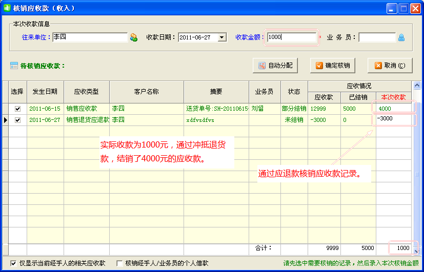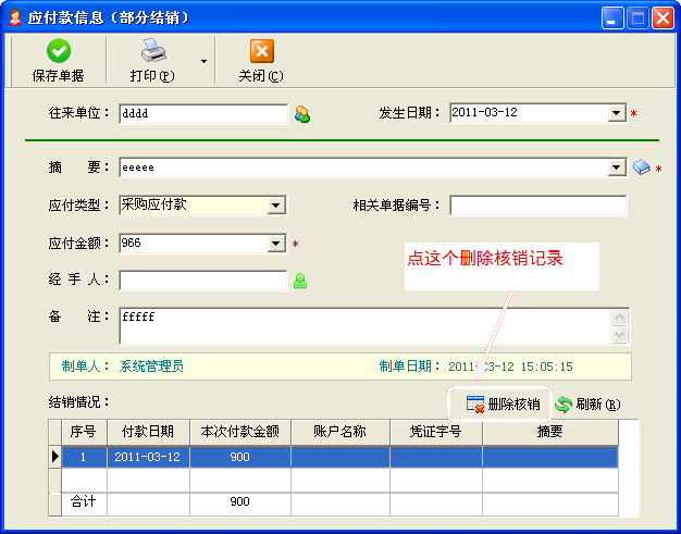 我公司的出納記賬軟件、進銷存軟件、送貨單軟件等都有應收款應付款往來帳管理功能,支持增加預付款、應退款,并可以將周期性的應收應付款進行批量增加(比如房租、車貸、固定收益等),在核銷往來帳時,預付款、應退款可以沖抵應收應付。核銷記錄可以轉記日記賬憑證。 有客戶在核銷往來帳時,有時會出現誤核銷的情況,這個時候想刪除核銷記錄,或者想刪除往來帳(應收款/應付款記錄),這個時候系統會提示“已經結銷的應收款/應付款記錄無法刪除”。 這個時候,你可以在應收款管理或應付款管理中,選擇相應的記錄,點“修改應收款”或者“修改應付款”按鈕,在彈