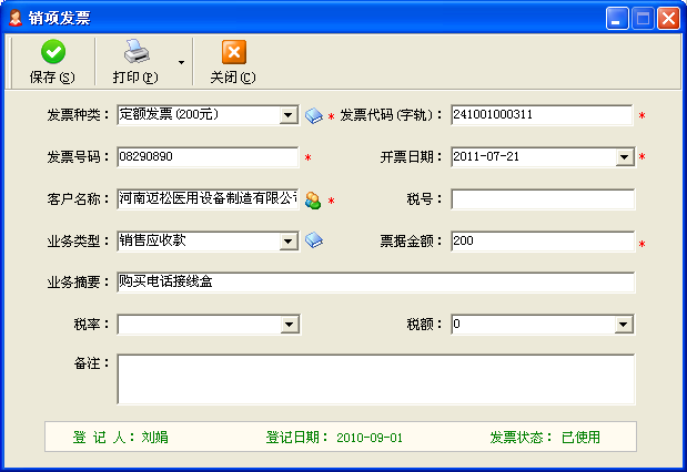 一、發票的登記銷項發票目前主要分為定額發票、增值稅發票、一般機打發票三種,公司會計人員在稅局購領后,需要在第一時間內,在《紅管家財務出納記賬系統》中進行登記。主要登記信息包括:發票種類:定額、增值稅、一般發票(手開/機打)。發票字軌:即發票代碼頭,本批發票前綴相同的特定字符。起始號碼:數字,用于批量生成發票號碼。發票張數購買日期及購買人發票樣本附件 二、發票的申領(1)部門負責人和銷售經理可根據項目要求,從公司紅管家財務記賬軟件中打印出開具發票的申請單,然后報公司財務室負責人簽字后,由專職會計負責開具正式發票(機打發票需要登錄地稅系統打印)。(2)會計在紅管家的發票管理中在對應的發票