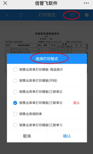 信管飛軟件支持PC端和手機(jī)微信端使用,用戶使用手機(jī)微信端可以開單和查詢操作,有用戶需要手機(jī)開單后直接發(fā)送打印預(yù)覽界面給客戶,手機(jī)微信端支持開單界面打印預(yù)覽,可在打印預(yù)覽界面保存預(yù)覽圖分享給客戶,本文示范下如何操作? 手機(jī)微信端登錄可查看此文章:信管飛軟件微信端如何使用? 微信端登錄后,新增銷售出庫單并保存,點(diǎn)擊右上角的豎三點(diǎn)符號,可彈出打印預(yù)覽操作界面。如下圖所示: 點(diǎn)擊“打印預(yù)覽”可顯示默認(rèn)模板的打印