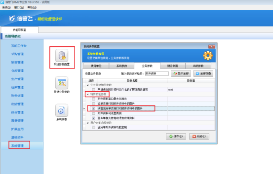 信管飛RMS是進(jìn)銷存一體化的軟件,支持開單上傳附件資料和開銷售出庫單可打印附件資料圖片,如果附件資料里面有多張圖片,那么如何一次性把附件資料的所有圖片都打印出來呢,本文以“信管飛RMS專業(yè)版”示范下如何設(shè)置? 在功能導(dǎo)航窗點(diǎn)擊“系統(tǒng)管理”—》“系統(tǒng)參數(shù)”,選擇“業(yè)務(wù)參數(shù)”“特殊功能參數(shù)”中的“銷售出庫單支持打印附件資料中的圖片”,勾選參數(shù)并保存配置,如下圖所示: 參數(shù)設(shè)置完成后,新開銷售出庫單,保存單據(jù)后點(diǎn)擊“附件資料”上傳附件資料圖片,如下圖所示: