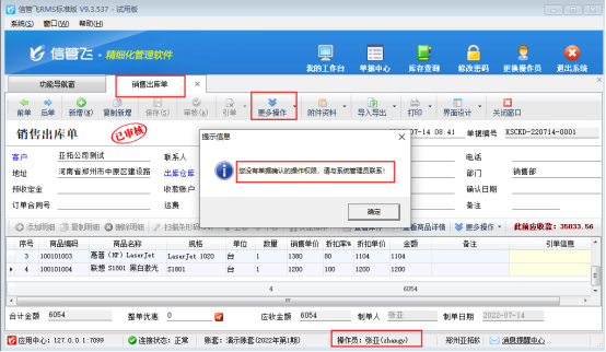 信管飛RMS軟件最新版支持在原有審核單據基礎上添加單據確認功能,單據確認后無法再修改,已審核未確認可以繼續反審修改單據,未避免確認功能操作員誤操作,軟件支持設置操作員的單據確認權限,本文以“信管飛RMS軟件”為例進行示范。 演示視頻觀看鏈接:信管飛RMS軟件如何控制操作員的單據確認權限演示視頻 功能導航窗點擊“系統管理”—》“操作員及授權”,在操作員及授權界面,選擇操作員“張亞”,功能模塊權限選擇“其他操作權限”,找到權限“可對單據進行確認”需要勾選