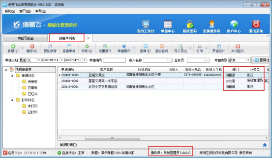 信管飛倉庫管理軟件、信管飛送貨單軟件、信管飛RMS軟件,都支持設置多個操作員并對操作員進行權限控制,通過設置操作員的“數據權限”,可以更精細的控制操作員對業務單據的查看權限。有用戶需要操作員只能查看本部門人員單據,以“信管飛倉庫管理軟件”為例,示范下如何操作? 示例:操作員“系統管理員”和操作員“張亞”分別屬于部門“辦公室”和“銷售部”使用操作員“系統管理員”登錄軟件,在功能導航窗點擊“系統管理”—》“操作員管理及授權”進入“操作員管理及授權”界面,在此界面可以增加操作員以及設置操作員權限,選擇操