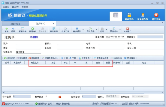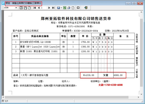 信管飛送貨單軟件、信管飛RMS軟件等可開銷售單和打印銷售單,軟件中默認有十幾種打印模板格式,有用戶需要在打印模板上體現客戶的欠款信息,內置模板中沒有此數據項,本文以內置模板進行示范如何添加客戶欠款數據項。 演示視頻:送貨單打印模板如何顯示客戶欠款? 新開一個送貨單并保存,選擇客戶“亞拓軟件測試”開單,界面上顯示應收款為1750(本單前應收款),本單應收4330,打印模板上需要顯示客戶欠款,在開單界面打印下選擇“打印格式設計”,進入打印格式設計界面,點