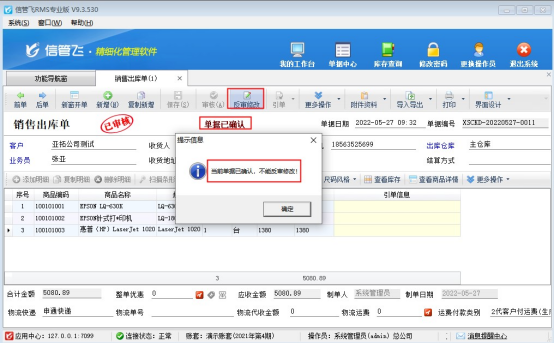信管飛RMS軟件支持設置操作員設置反審修改權限,操作員有反審修改權限就可以對已審核單據進行反審操作,有客戶需要已審核的單據不能再進行修改,針對這一情況,最新版本添加了單據確認功能,本文示范下單據確認功能如果使用? 演示視頻觀看鏈接:信管飛RMS單據確認功能如何使用演示視頻 功能導航窗點擊“系統管理”—》“系統參數配置”,“業務參數”中特殊功能參數中勾選“啟用單據確認功能”參數,保存配置,如下圖: 參數啟用完成后,銷