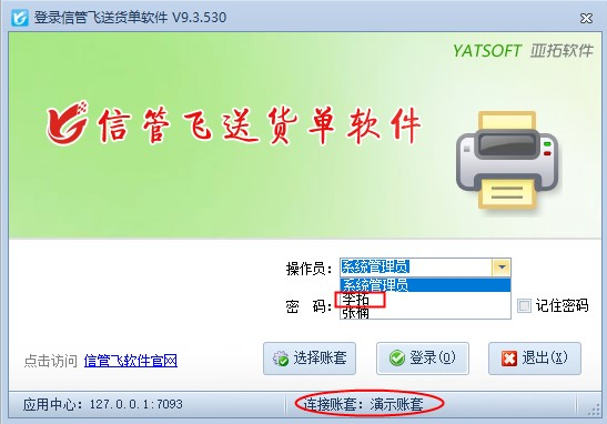 信管飛系列軟件都支持設置多個操作員登錄軟件,可控制操作員的權限,如存在登錄操作員離職情況,軟件如何設置刪除操作員和添加新操作員操作,本文以“信管飛送貨單軟件”為例進行示范下。 信管飛送貨單軟件在系統管理—操作員及授權中添加操作員及權限添加后,在軟件客戶端程序登錄界面,操作員列表可查看可登錄的所有操作員名字,如下圖所示: 員工“張亞”離職后,登錄界面需要刪除此操作員記錄,登錄“系統管理員”,功能導航窗點擊“系統管理”—》“操作員及授權”,在操作員及授權