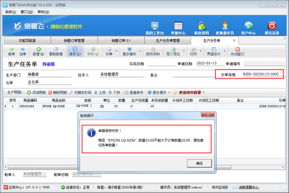 生產(chǎn)任務(wù)單,即生產(chǎn)過(guò)程中的任務(wù)加工單,用于執(zhí)行生產(chǎn)計(jì)劃,進(jìn)入實(shí)際生產(chǎn)階段。生產(chǎn)任務(wù)單支持引用銷售訂單及生產(chǎn)計(jì)劃單進(jìn)行開(kāi)單下達(dá)生產(chǎn)任務(wù)數(shù)量,本篇文章介紹一下生產(chǎn)任務(wù)單引用銷售訂單開(kāi)單的情況下,如何設(shè)置生產(chǎn)任務(wù)單數(shù)量不可大于銷售訂單數(shù)量? 在功能導(dǎo)航窗點(diǎn)擊“系統(tǒng)管理”—》“系統(tǒng)參數(shù)配置”—》“業(yè)務(wù)參數(shù)”打開(kāi)業(yè)務(wù)參數(shù)配置界面,在生產(chǎn)管理相關(guān)參數(shù)中打鉤啟用“生產(chǎn)任務(wù)單數(shù)量不可大于銷售訂單數(shù)量”參數(shù),如下圖所示。 參數(shù)配置完成之后,新開(kāi)一個(gè)銷售訂單,如下圖所示。