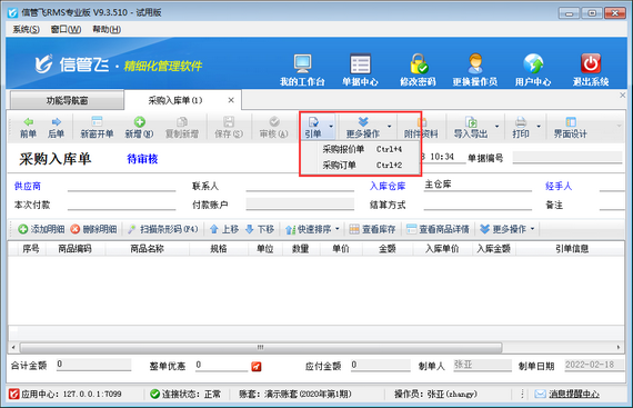 信管飛RMS(進(jìn)銷存管理軟件)支持根據(jù)銷售訂單進(jìn)行采購(gòu)入庫(kù)進(jìn)貨(如下圖所示),同時(shí)也支持配置操作員采購(gòu)入庫(kù)單引用銷售訂單開(kāi)單權(quán)限,本篇文章介紹一下進(jìn)銷存管理軟件內(nèi)如何設(shè)置操作員開(kāi)采購(gòu)入庫(kù)單不可引用銷售訂單? 在功能導(dǎo)航窗點(diǎn)“系統(tǒng)管理”—》“操作員及授權(quán)”即可進(jìn)入“操作員管理及授權(quán)”界面,選中操作員賬號(hào),在“其他操作權(quán)限”界面將“采購(gòu)入庫(kù)單可引用銷售訂單”權(quán)限打鉤取消,然后保存權(quán)限設(shè)置,如下圖所示,設(shè)置操作員張亞沒(méi)有“采購(gòu)入庫(kù)單可引用銷售訂單”權(quán)限。 設(shè)置完成后,我們使用操作員賬號(hào)登錄軟