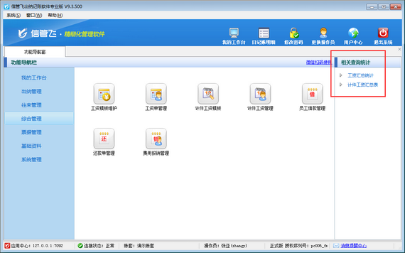 信管飛出納記賬軟件內(nèi)支持計(jì)件工資管理功能,可以對(duì)公司內(nèi)部根據(jù)計(jì)件進(jìn)行核算工資的員工工資進(jìn)行管理,本篇文章介紹一下出納記賬軟件內(nèi)如何設(shè)置操作員不可維護(hù)計(jì)件工資模板? 在功能導(dǎo)航窗點(diǎn)擊“系統(tǒng)管理”—》“操作員及授權(quán)”,打開(kāi)操作員管理及授權(quán)界面,選擇操作員“張亞”,在其右側(cè)的功能模塊權(quán)限內(nèi)選擇“綜合管理”模塊,將“計(jì)件工資模板”的“新增、修改、刪除”權(quán)限勾選取消,然后保存設(shè)置,如下圖所示。 操作員權(quán)限設(shè)置完成后,關(guān)閉當(dāng)前窗口,更換操作員“張亞”登錄軟件,打開(kāi)“綜合管理”—》“計(jì)件工資管理”界