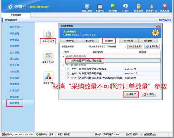 在采購業務里,不少客戶會先按需求開采購訂單,采購人員再依單采購入庫。但實際采購時,常出現采購數量大于訂單數量的情況,當出現這種情況后,部分客戶在進行開單時,會因系統限制,提示采購數量超限而無法保存單據。別擔心,信管飛RMS軟件能輕松化解這一難題! 簡單設置,開啟靈活采購 只需在功能導航窗依次點擊“系統管理”—“系統參數配置”—“業務參數”,進入“業務參數”界面,取消勾選“采購數量不可超過訂單數量”參數,然后點擊“保存”按鈕,配置就完成啦,操作簡單又快