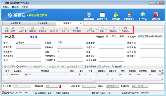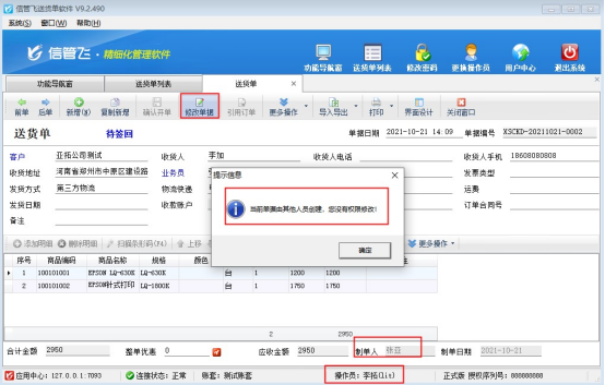 信管飛系列軟件都支持新增多個操作員來登錄軟件使用軟件,為避免不同操作員之前修改各自單據,軟件可控制操作員權限不能修改其他人制的單據。本文以“信管飛送貨單軟件”為例,示范下如何配置? 在功能導航窗點擊“系統管理”—》“操作員及授權”,進入操作員及授權界面,選擇操作員“李拓”,在“數據權限”中,把“送貨單、退貨單”權限對應的“可修改有查看權限的數據”選擇取消勾選,保存權限設置。如下圖所示: 權限設置完成后,登錄操作員“張亞”,新開一筆送貨單。如下圖所示: